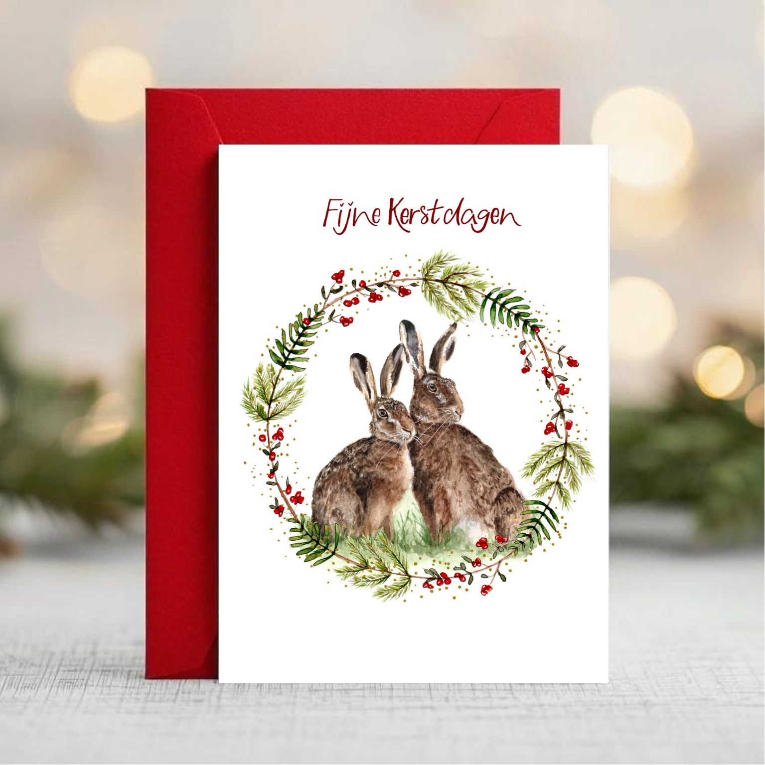 8 dubbele kerstkaarten met een rode envelop. Aquarel illustratie van twee hazen in een kerstkrans. Formaat kaart: 10,5 x 15 cm. Binnenin is de kaart blanco.