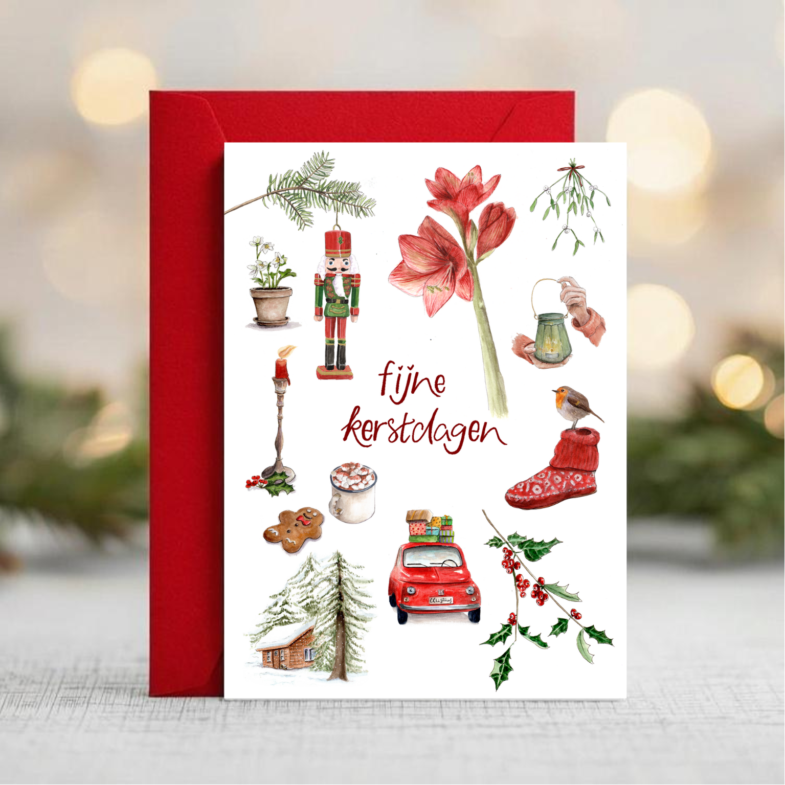 8 dubbele kerstkaarten met een rode envelop. Aquarel kerst illustratie . Formaat kaart: 10,5 x 15 cm. Binnenin is de kaart blanco.